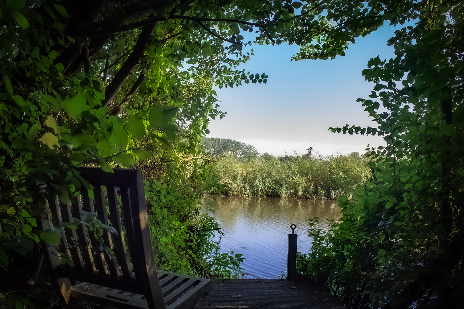 Am Tief befindet sich eine Sitzmöglichkeit. Genießen Sie von hier die Aussicht über die Wiesen bis zur Mühle von Westeraccum.